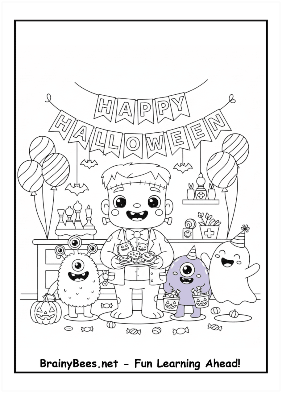 Halloween Frankie Party Monsters Coloring Page | BrainyBees