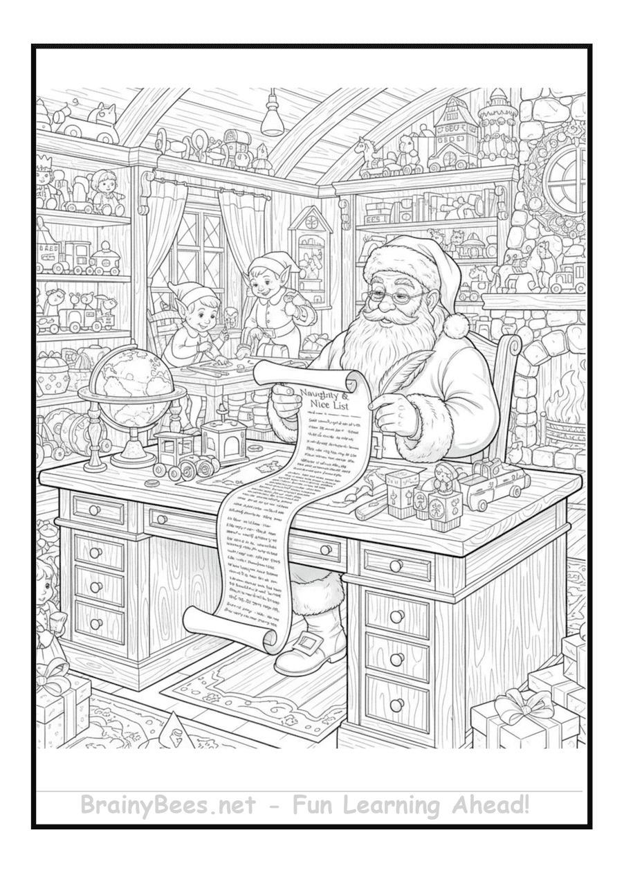 Christmas Santa Elves Workshop Gifts List Coloring Page | BrainyBees