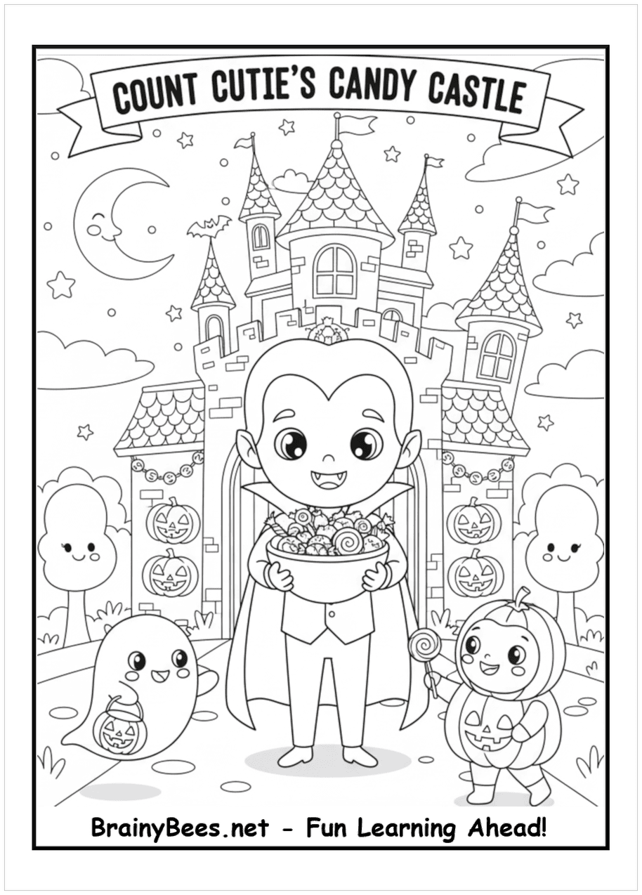 Halloween Baby Girl Dracula Castle Coloring Page | BrainyBees